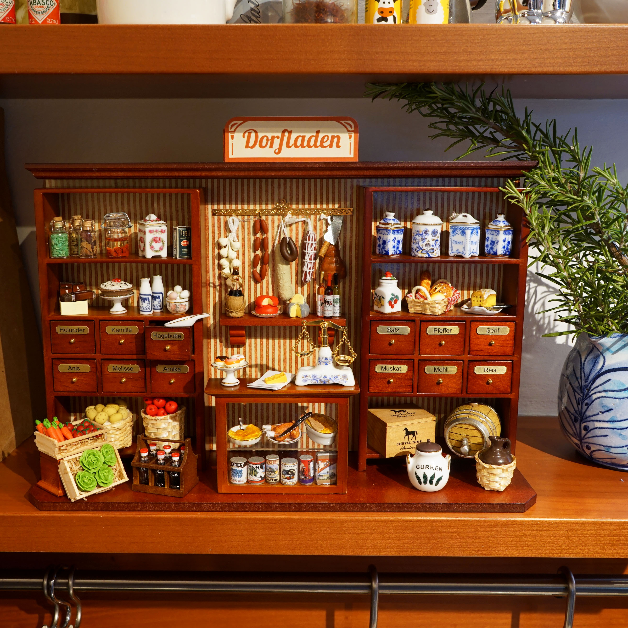 Stellen Sie sich beispielsweise einen typischen Dorfladen vor, mit braunen Regalen, in denen verschieden dekorierte Porzellangefäße für Tee und Kaffee stehen. Neben dem vielen Eingemachten in Gläsern und Konserven für die Vorratshaltung, gibt es auch frische Ware von der Theke oder aus dem Fass, wie abgehangene Wurstsorten, Käse, Gemüse und Obst. Für das besondere Dorfladen-Flair sorgt die hochwertige Porzellanwaage, die alles genau abwiegt.