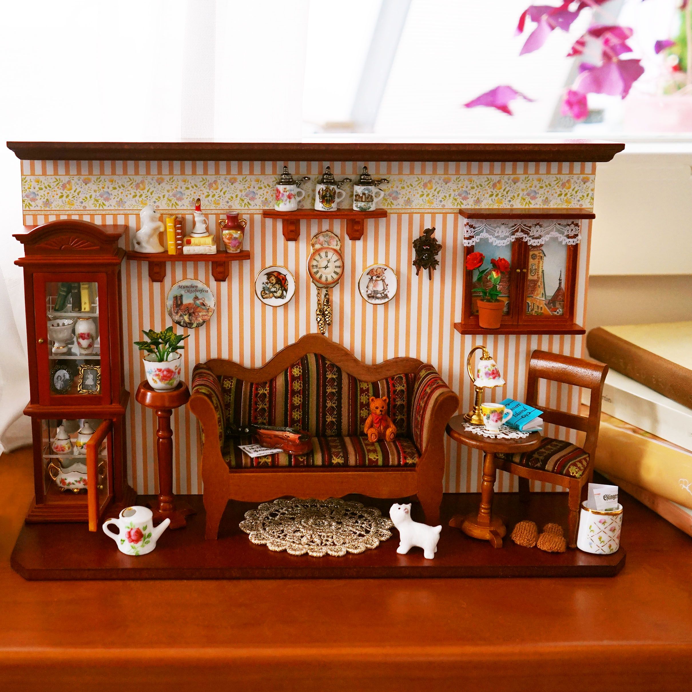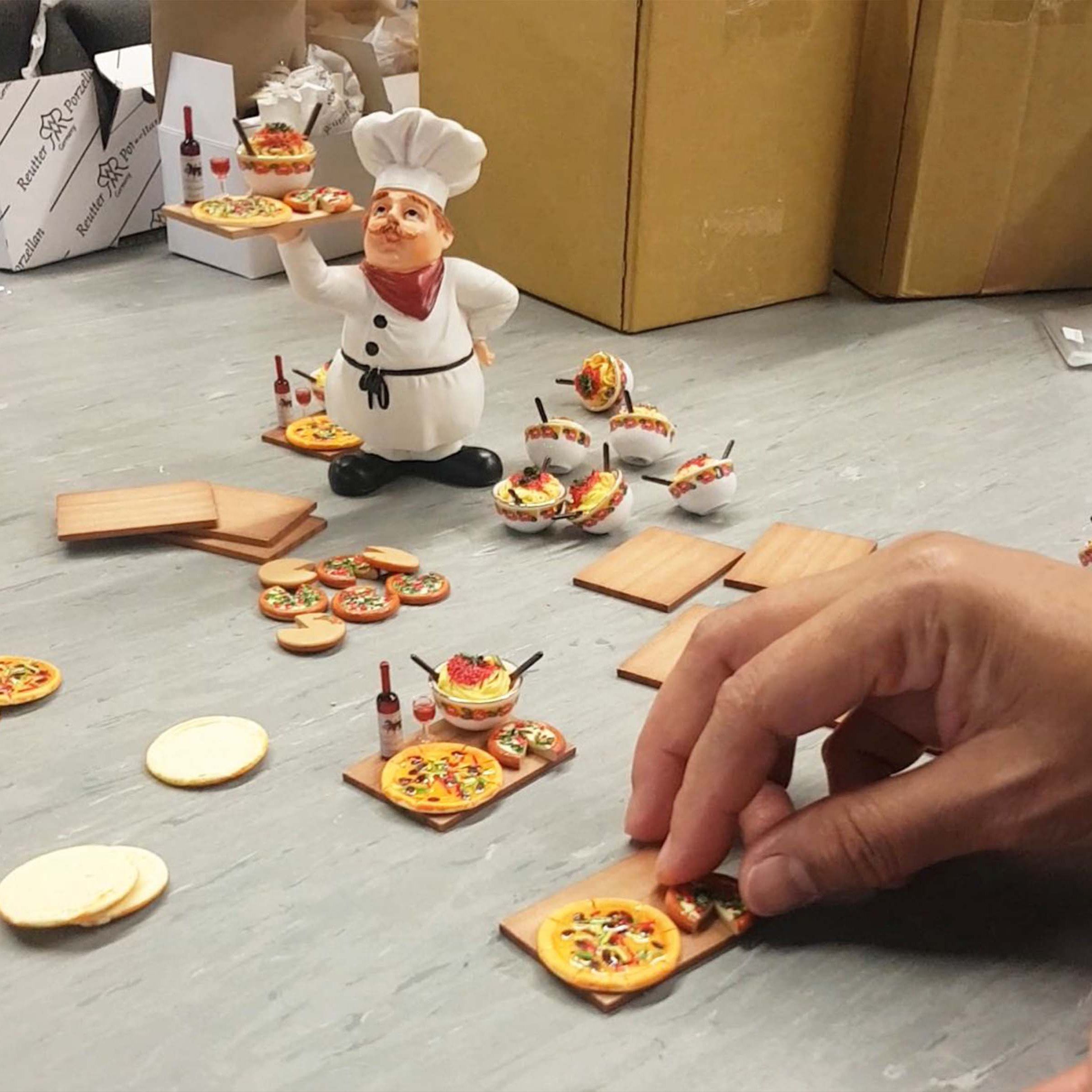 Finally, the biggest and one of the most exciting parts begins when the different miniatures in size 1:12 are combined together. Sometimes the finished combination consists miniatures out of up to 8 different materials. For example, they are assembled as miniature compositions, decorated pieces of furniture, or arranged into room boxes as harmonious scenes. This work requires a lot of experience, ideas for interior design and a steady hand to put this extremely small items together.